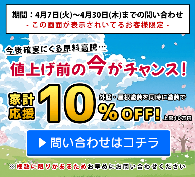 そのため、使用する塗料にもよりますが、最長10年の保証をお付けします。この期間に不具合があれば無料で塗り直しや補修をいたします。